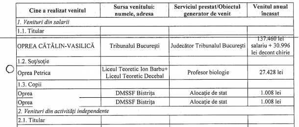 Potrivit declarației de avere, Cătălin Oprea câștigă în calitate de judecător la Tribunalul București 137.460 de lei anual. La această sumă se mai adaugă 31.000 de lei pentru chirie.
