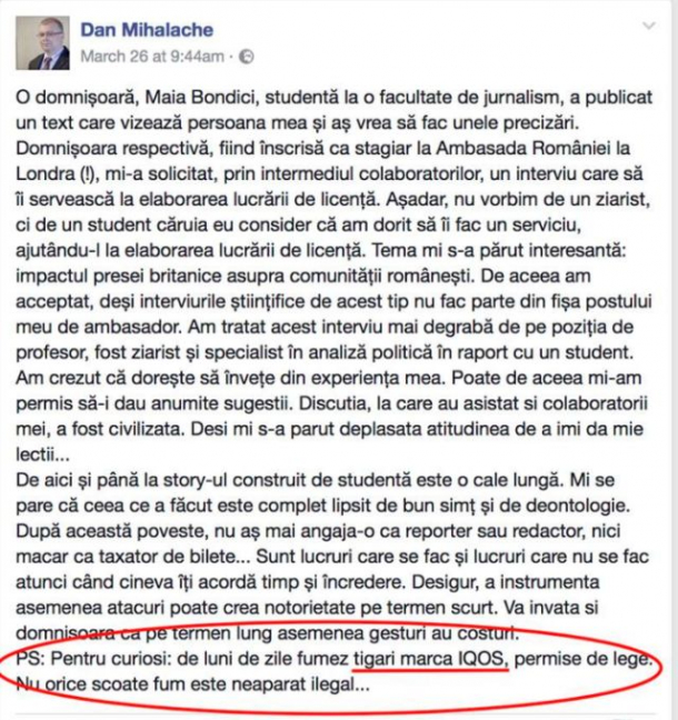 Dovada FOTO că Dan Mihalache fumează ŢIGĂRI NORMALE, nu IQOS, în Ambasada României la Londra