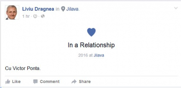 De pe pagina de socializare mai aflăm că Liviu Dragnea este “într-o relație” cu Victor Ponta și că locuiesc împreună… la Jilava.