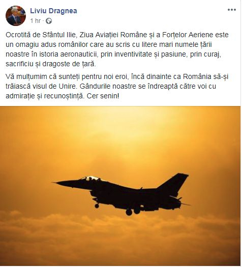 Liviu Dragnea nu a ratat ocazia vineri ocazia de a posta un mesaj, cu ocazia Zilei Aviaţiei Române şi a Forţelor Aeriene, piloţilor români.