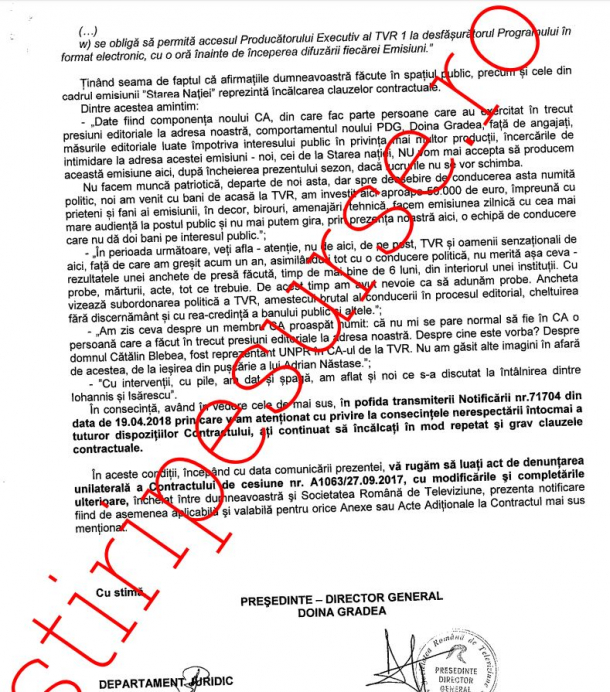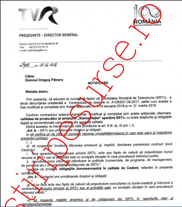 Astfel, prin semnătura Doinei Gradea, preşedinte-director general TVR, colaborarea jurnalistului Dragoş Pătraru cu televiziunea publică a fost încheiată, iar emisiunea „Starea Naţiei” nu va mai fi pe post.