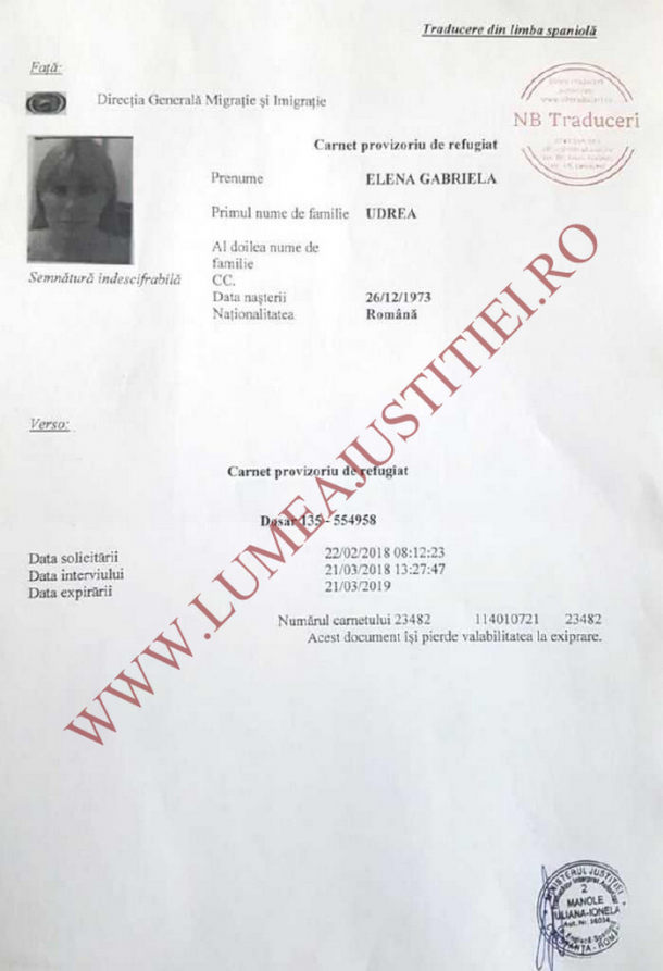 Ulterior, într-o intervenţie telefonică la Antena 3, Elena Udrea a afirmat că are un carnet de refugiat cu valabilitate de un an, cu posibilitatea ca statutul de refugiat să fie dobândit definitiv.