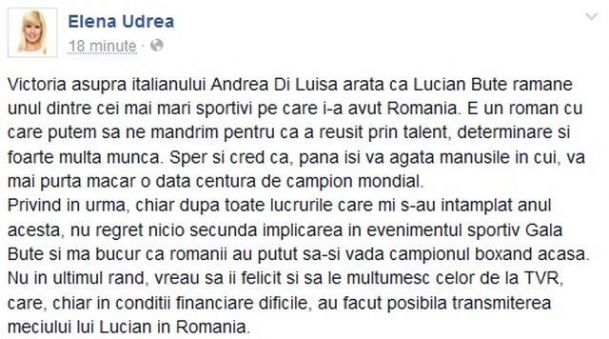 Nu în ultimul rând, vreau să îi felicit și să le mulțumesc celor de la TVR, care, chiar în condiții financiare dificile, au făcut posibilă transmiterea meciului lui Lucian în România”, este mesajul postat de Udrea pe rețeaua de socializare.