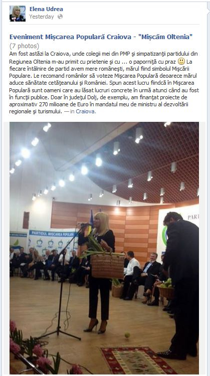”La fiecare întâlnire de partid avem mere româneşti, mărul fiind simbolul Mişcării Populare. Le recomand românilor să voteze Mişcarea Populară deoarece mărul aduce sănătate cetăţeanului şi României”, a mai scris ea.
