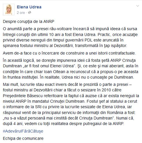 Elena Udrea a postat un nou mesaj pe contul său de Facebook, cu privire la raportul apărut în presă despre neregulile de la ANRP.