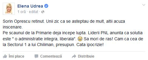 ”Sorin Oprescu reținut. Unii zic că se așteptau de mult, alții acuză înscenare. Pe scaunul de la Primărie deja începe lupta. Liderii PNL anunță că soluția este „o administrație integră, liberală”. Să mori de râs! Cam ca cea de la Sectorul 1 a lui Chiliman, presupun. Câtă ipocrizie!”, a notat Elena Udrea pe Facebook.