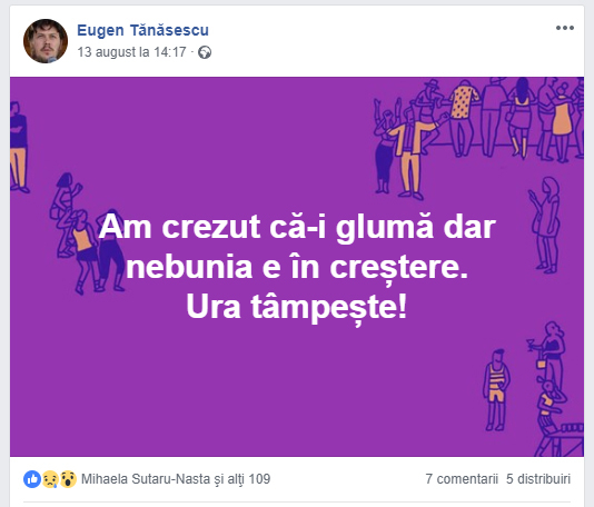 Într-o altă postare, amintește constantadeazi.ro, Tănăsescu a scris: ”Am crezut că-i glumă dar nebunia e în creștere. Ura tâmpește!“.