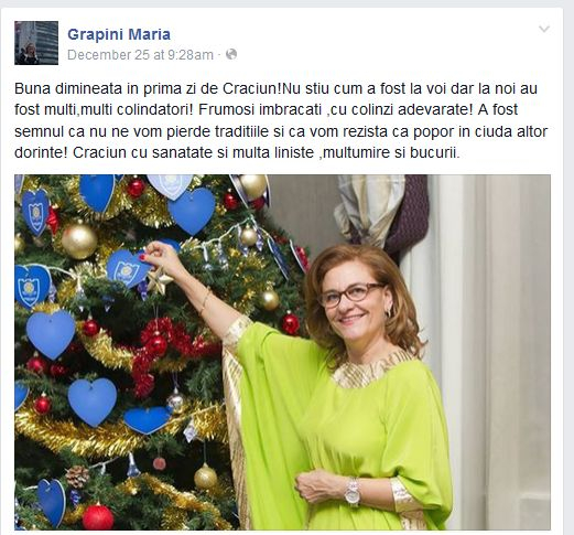 ”Buna dimineata in prima zi de Craciun!Nu stiu cum a fost la voi dar la noi au fost multi,multi colindatori! Frumosi imbracati ,cu colinzi adevarate! A fost semnul ca nu ne vom pierde traditiile si ca vom rezista ca popor in ciuda altor dorinte! Craciun cu sanatate si multa liniste ,multumire si bucurii.”, e mesajul postat de Maria Grapini pe Facebook.