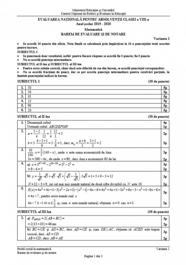Evaluare Națională 2020. Baremul de corectare la Matematică