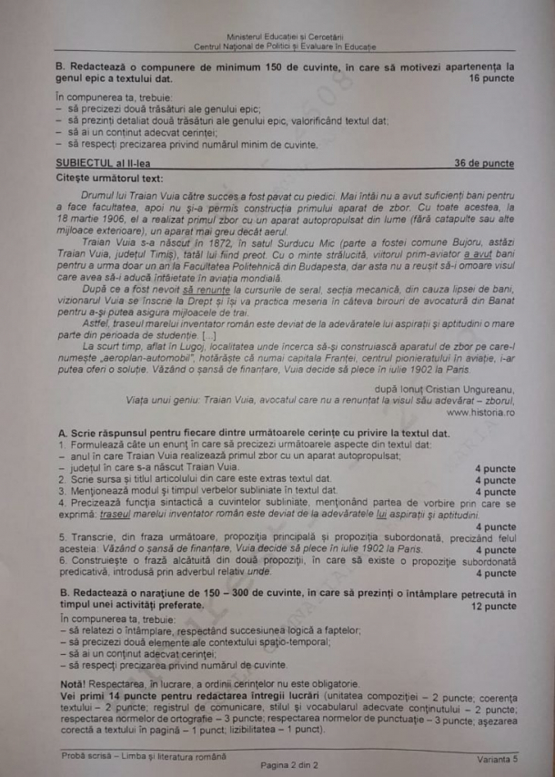 La Subiectul I B, absolvenții de gimnaziu au avut de făcut o compunere de minimum 150 de cuvinte, în care să motiveze apartenența la genul epic a textului avut la primul punct.