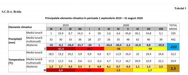Potrivitcercetătorilor, atât creşterea temperaturii medii, cât şi lipsa precipitaţiilor, care au înregistrat abateri negative faţă de multianuală de -61,4 mm/m2 în toamna anului 2019, urmată de un deficit de -44,7 mm/m2 în iarnă, apoi de -56 mm/m2 în primăvară şi de -59 mm/m2 în vara aceasta, totalizând pe tot anul agricol un deficit total de -222 mm/m2 în Câmpia Brăilei, au dus la afectarea tuturor culturilor de toamnă şi de primăvară, cât şi a culturilor perene.
