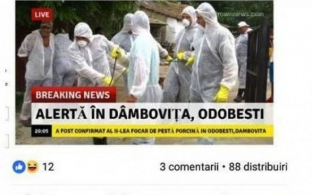 „Breaking News. Alertă în Dâmboviţa, Odobeşti. A fost confirmat al II-lea focar de pestă porcină, la Odobeşti, Dâmboviţa”, transmitea tânărul, mesajul fiind însoţit de o fotografie de tip „breaking news”.