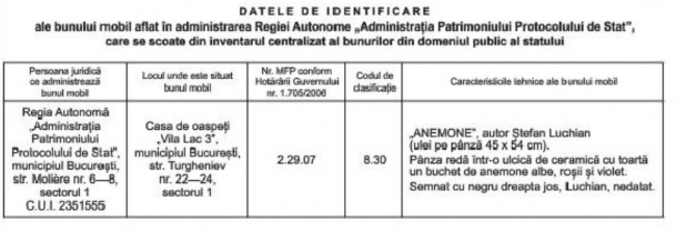 Tablou „Anemone” de Ştefan Luchian, care se afla până acum expus pe pereţii Vilei Lac 3, reşedinţa prezidenţială din Cartierul Primăverii, a fost scoas din patrimoniul public al statului şi din administrarea RAAPPS , scrie BN24.