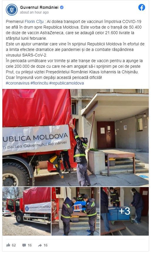 Florin Cîţu a anunţatsâmbătă,că un transport de50.400 de doze de vaccin AstraZeneca aplecat din România către Republica Moldova. Aceasta este a doua tranșă care este trimisă peste Prut, după cea de21.600 doze livrate la sfârşitul lunii februarie. Guvernul României va continua să sprijine țara vecină cu seruri anti-COVID-19.