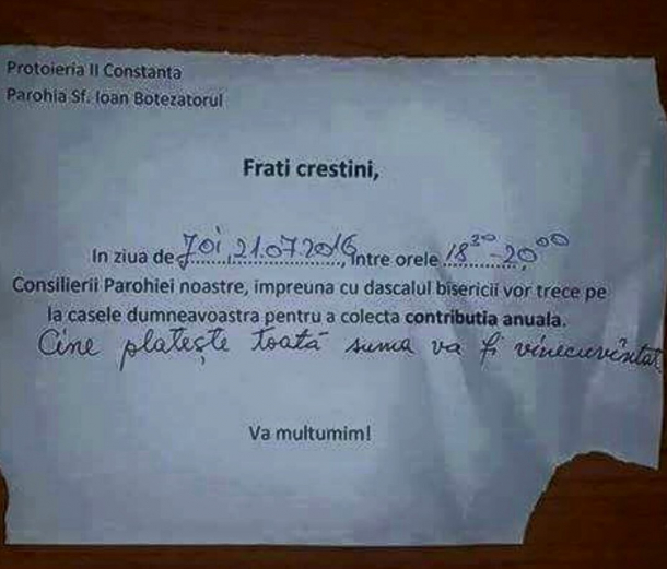 Binecuvântarea se obține cu bani la Constanța. Preoții Parohiei “Sf. Ioan Botezătorul” au postat un anunț în scările de bloc din oraș prin care anunță că vor trece pe la fiecare apartament pentru a colecta „contribuția anuală” și le promite celor care vor achita întreaga sumă binecuvântarea, scrie Aktual24.