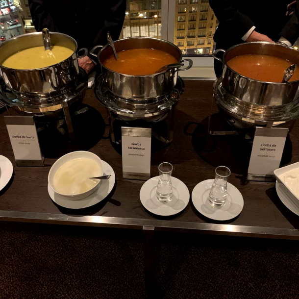 Directorul hotelului i-a învăţat, înaintea sărbătorii de 1 Decembrie, pe celebrii bucătari ai Hotelului Trump, cum să prepare ciorbă de perișoare, ciorbă de burtă și țărănească, sarmale la cuptor, mămăligă, dar și mici și cârnați pentru americanii de origine română care au ales să petreacă ziua Marii Uniri pe una din terasele gigantului de 92 de etaje, relatează libertatea.ro.