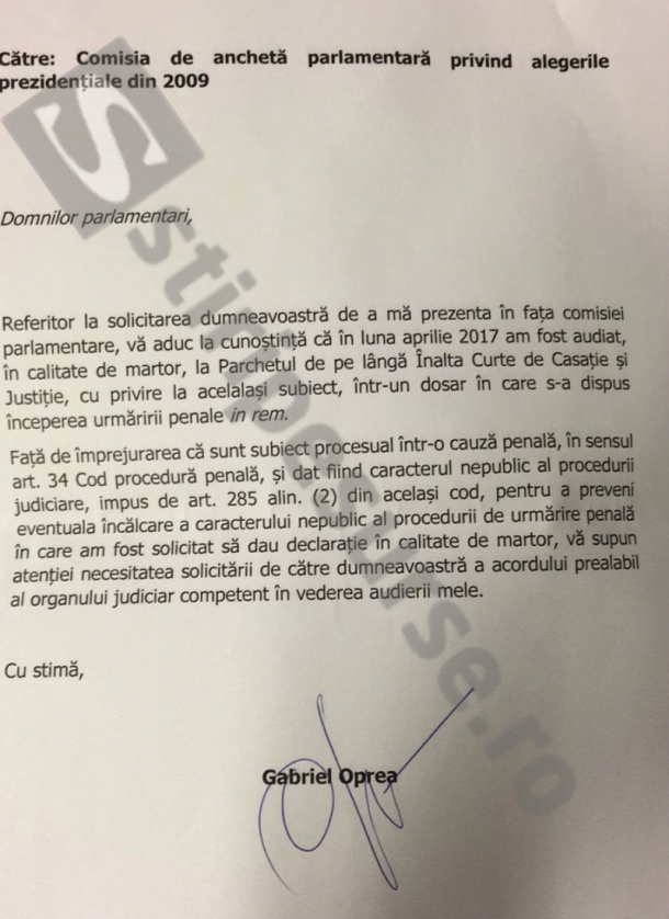 Într-o scrisoare trimisă Comisiei, Oprea precizează că a fost audiat la Parchetul General în dosarul deshis în aceeaşi cauză și susține că Parlamentul ar trebui să ceară procurorilor un acord pentru audierea sa.