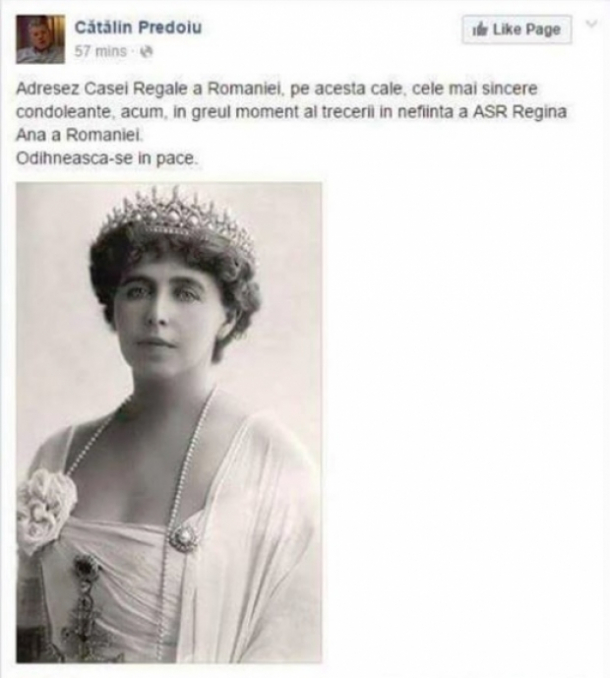 Din prea mult exces de zel, prea multă emoţie sau din. pură neatenţie, unul dintre liderii PNL a reuşit să comită o gafă fabuloasă pe pagina sa de Facebook. Este vorba despre prim-vicepreşedintele liberal Cătălin Predoiu care s-a simţit dator să transmită condoleanţe Casei Regale în urma decesului reginei Ana. Numai că mesajul său plin de patos a fost ilustrat cu o poză a regretatei regina Maria, soția Regelui Ferdinand al României, potrivit B1 TV.