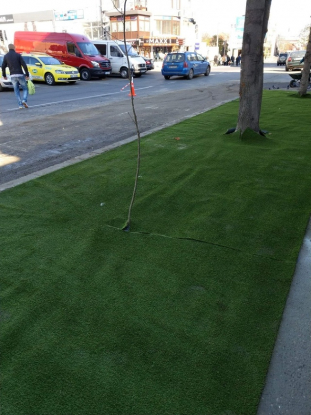 Reprezentanții primăriei din Bacău au anunțat că au „plantat”, în zona Pieței Centrale, pe un trotuar unde, din cauza traficului, alte tipuri de gazon nu au rezistat, gazon artificial.