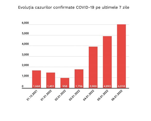 6.018 cazuri au fost raportate în ultima zi, cele mai multe în Bihor (234), Brașov (253), Cluj (361), Constanța (222), Ilfov (202), Suceava (297), Timiș (299) și București (961).