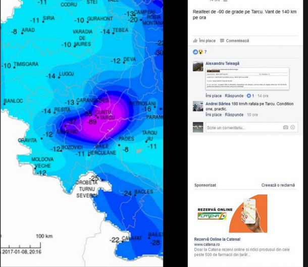 În zona Ţarcu, în apropiere de Cacansebeş, temperatura resimţită, duminică, a fost de minus 90 de grade Celsius. Viteza vântului a fost de 140 km/oră, ajungând chiar până la 180 km/oră.