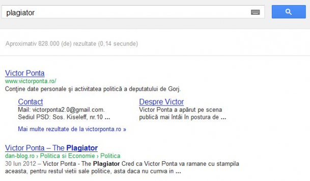 Prima soluţie pentru cuvântul plagiator este chiar pagina oficială a premierului Victor Ponta, iar următoarele rezultate conţin, de asemenea, referiri la persoana prim ministrului.