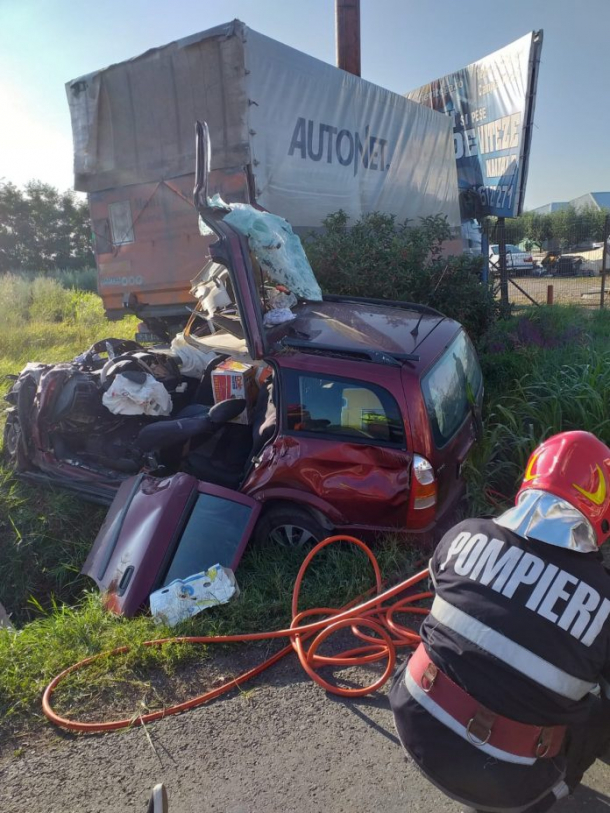 Accident grav sâmbătă dimineața, 13 iulie, în județul Vrancea. Un autocamion care circula din direcția Garoafa- Focșani a pătruns pe contrasens și a intrat în coliziune cu un autoturism care se deplasa regulamentar.