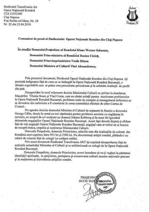 Scrisoare îi este adresată lui Klaus Iohannis, premierului Dacian Cioloș, vicepremierului Vasile Sebastian Dâncu și ministrului culturii Vlad Alexandrescu. Sindicatul dezaprobă vehement decizia Ministrului Culturii cu privire la demiterea maeștrilor Tiberiu Soare și Vlad Conta, care au căutat soluții pentru rezolvarea problemelor la Opera Națională Română București.