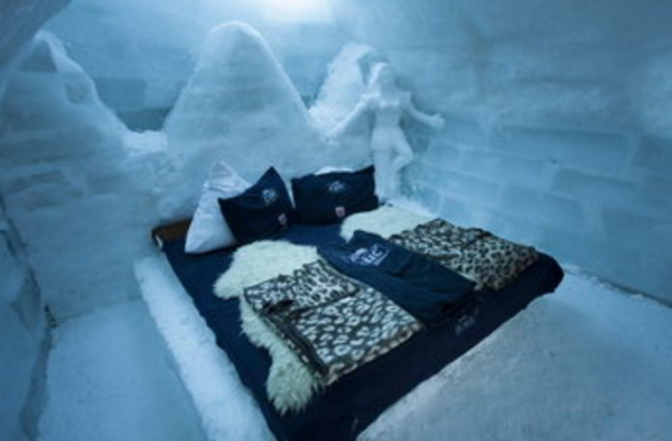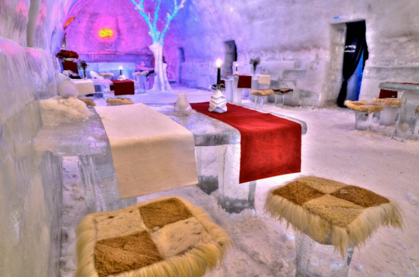 Nu numai hotelul a fost construit din gheată, dar și un bar din gheață, cu pahare din gheață și un restaurant cu mese, scaune tot din gheață.