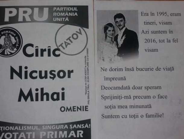 ”Era în 1995, eram tineri, visam. Azi suntem în 2016, tot la fel visăm. Ne dorim însă bucurie de viaţă împreună. Deocamdată doar sperăm. Sprijiniţi-mă precum o face soţia mea minunată. Suntem cu toţii o familie!” scrie pe o parte a pliantului, lângă poza de nuntă a candidatului în care acesta apare în costum de ginere cu floarea în piept alături de soţia îmbrăcată evident în mireasă”, scrie pe unul dintre pliante, potrivit Libertatea.