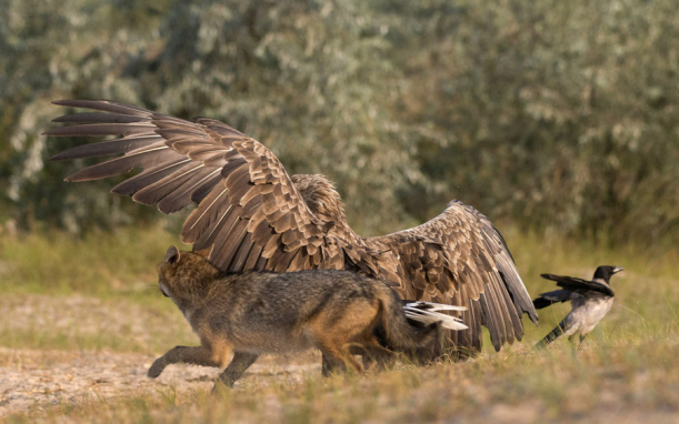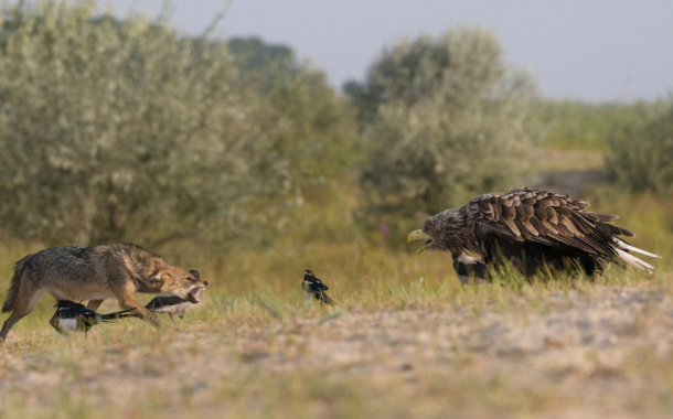 IMAGINI DE COLECȚIE din Delta Dunării. Momentul în care un vultur apără niște păsări de atacul unui coiot (FOTO)