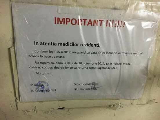 Medicii rezidenți anunță proteste și cer Ministrului Sănătății garanții că salariile lor nu vor scădea și că de la 1 ianuarie 2018 vor primi contravaloarea bonurilor de masă în bani. Totodată, aceștia solicită insistent plata gărzilor începând din anul I de rezidențiat.