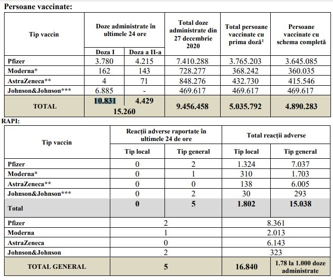 Datele oficiale arată că, în ultimele 24 de ore, 15.260 de persoane au fost vaccinate anticoronavirus, din care 10.831 au primit prima doză și 4.429 cu rapelul. Au fost raportate cinci reacții adverse, toate de tip general.