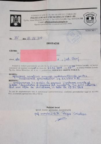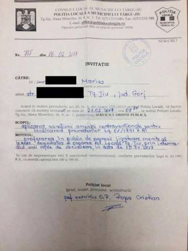 Motivul invitării celor şapte cetăţeni în vederea amendării este „proferarea în public de expresii jignitoare, menite să lezeze demnitatea şi onoarea Poliţiei Locale Târgu Jiu, prin intermediul unei reţele de socializare, în data de 15 ianuarie 2017”.