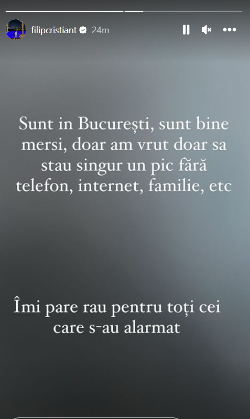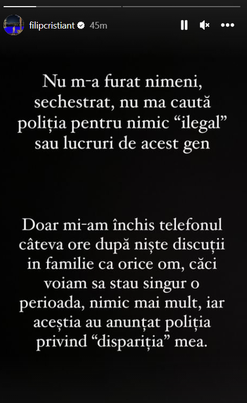 „Nu m-a furat nimeni, sechestrat, nu mă caută poliția pentru nimic „ilegal” sau lucruri de acest gen. Doar mi-am închis telefonul câteva ore după niște discuții în familie ca orice om, căci voiam să stau singur o perioadă, nimic mai mult, iar aceștia au anunțat poliția privind „dispariția” mea”, a scris Filip Cristian pe contul său de Instagram.