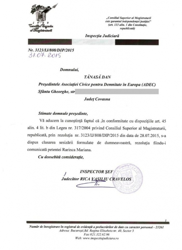 Inspecția Judiciară din cadrul Consiliului Superior al Magistraturii a clasat sesizarea Asociației Civice pentru Demnitate în Europa (ADEC) în cazul abuzurilor săvârșite în cazul Marianei Rarinca, conform jurnalistului Dan Tănasă. Acesta scrie pe blogul personal că Inspecția Judiciară a constatat faptul că nu există indicii cu privire la săvârșirea unor abateri disciplinare ale magistraților în cazul Rarinca.