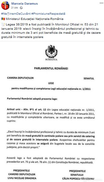 Un inspector școlar din Alba a publicat pe Facebook o lege care nu există. Gafa de proporții a fost comisă de inspectorul școlar general al Inspectoratului Școlar Județean Alba, Marcela Dărămuș. Aceasta a distribuit pe rețeaua socială o imagine cu un document potrivit căruia, elevii din învățământul profesional şi tehnic cu durata minimum de trei ani vor putea beneficia de masă gratuită şi de cazare gratuită în internatele şcolare.