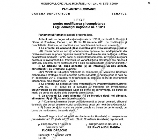 Este vorba despre Legea nr. 38/2019 pentru modificarea și completarea Legii educației naționale nr. 1/2011, publicată în MO, Partea I, nr. 53/21.01.2019, care prevede introducerea unei noi materii, respectiv Educația pentru sănătate și nutriție, începând cu anul școlar 2020 – 2021. În aceeași lege este prevăzută și posibilitatea de a se organiza învățământ la domiciliu pentru copiii cu cerințe educaționale speciale sau nedeplasabili din motive medicale.