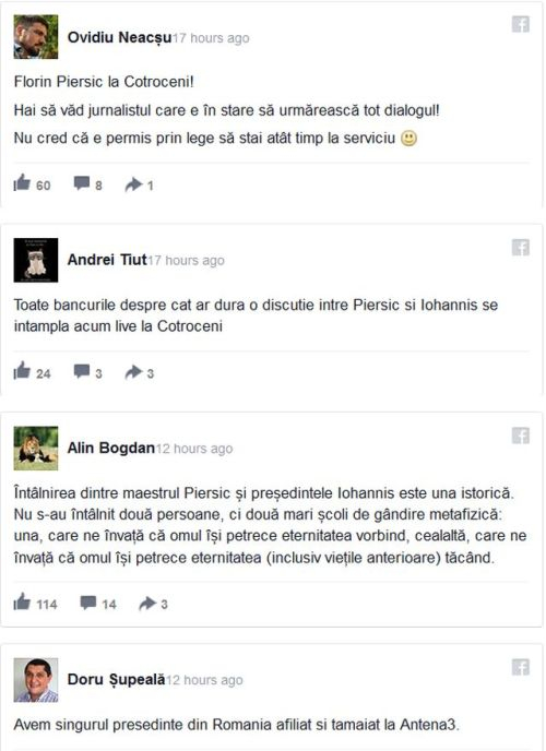 Conform Hotnews, moderatori consacrați ai postului trustului fondat de Dan Voiculescu precum Dana Grecu, Răzvan Dumitrescu și Mihai Gâdea, șeful Antena 3, i-au adus elogii președintelui, catalogând totodată evenimentul de la Cotroceni, altfel unul obișnuit, ca fiind “Momente frumoase și emoționante”.