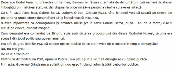 Jurnalistul vorbește despre dictatura Binomului asupra scenei politice care, spune acesta, a fost posibilă și din cauza prevederii privind denunțul.