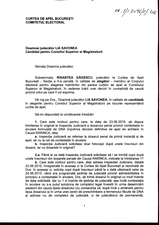 În calitate de alegător, judecătoarea Risantea Găgescu, cea căreia i s-a luat Dosarul Rarinca pentru a fi dat cui trebuie, a adresat candidatei o listă de întrebări despre rolul jucat în abuzurile împotriva Marianei Rarinca.