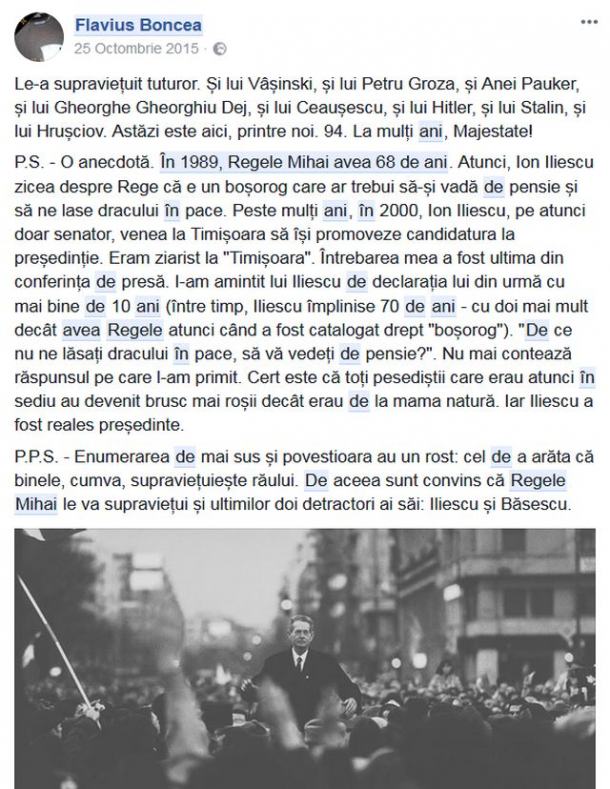 De aceea sunt convins că Regele Mihai le va supravieţui şi ultimilor doi detractori ai săi: Iliescu şi Băsescu. Şi detractărilor, mult mai numeroase, la adresa Familiei Sale", scria Flavius Boncea pe Facebook, în ziua în care Regele Mihai împlineaa împlinit 95 de ani.