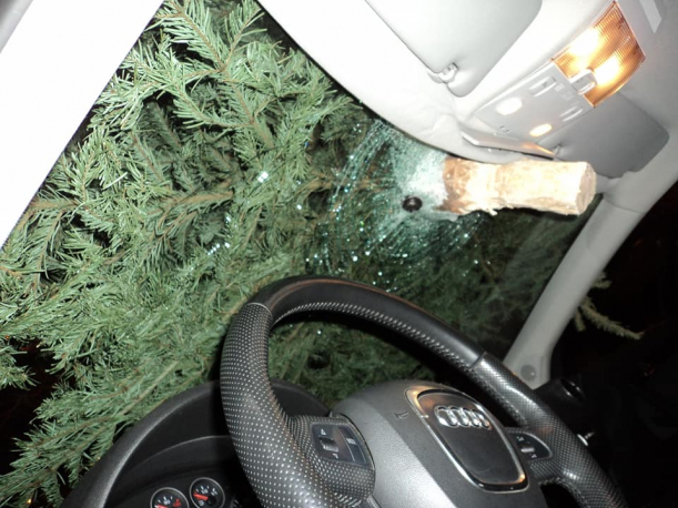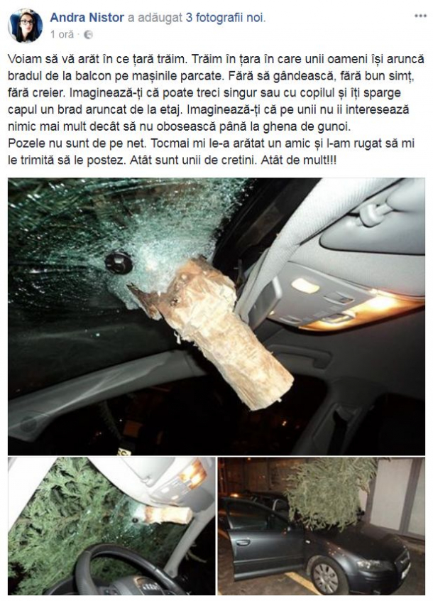 Câteva poze publicate de Andra Nistor cu un pom de Crăciun în parbrizul unei mașini sunt virale pe Facebook.