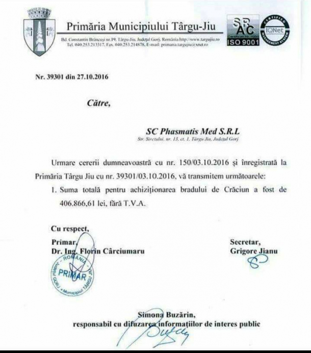 La Târgu-Jiu, în această iarnă va fi aprins cel mai scump brad de Crăciun din România. Primăria Târgu-Jiu a plătit pe el 90.000 de euro un brad, fără TVA.