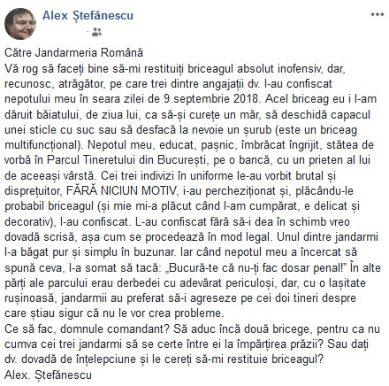 „Vă rog să faceți bine să-mi restituiți briceagul absolut inofensiv, dar, recunosc, atrăgător, pe care trei dintre angajații dv. l-au confiscat nepotului meu în seara zilei de 9 septembrie 2018. Acel briceag eu i l-am dăruit băiatului, de ziua lui, ca să-și curețe un măr, să deschidă capacul unei sticle cu suc sau să desfacă la nevoie un șurub (este un briceag multifuncțional). Nepotul meu, educat, pașnic, îmbrăcat îngrijit, stătea de vorbă în Parcul Tineretului din București, pe o bancă, cu un prieten al lui de aceeași vârstă. Cei trei indivizi în uniforme le-au vorbit brutal și disprețuitor, FĂRĂ NICIUN MOTIV, i-au percheziționat și, plăcându-le probabil briceagul (și mie mi-a plăcut când l-am cumpărat, e delicat și decorativ), l-au confiscat. L-au confiscat fără să-i dea în schimb vreo dovadă scrisă, așa cum se procedează în mod legal. Unul dintre jandarmi l-a băgat pur și simplu în buzunar. Iar când nepotul meu a încercat să spună ceva, l-a somat să tacă: „Bucură-te că nu-ți fac dosar penal!” În alte părți ale parcului erau derbedei cu adevărat periculoși, dar, cu o lașitate rușinoasă, jandarmii au preferat să-i agreseze pe cei doi tineri despre care știau sigur că nu le vor crea probleme.