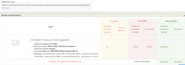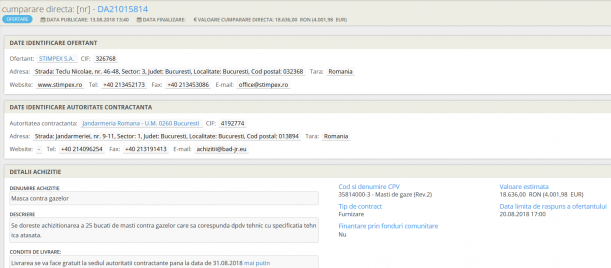 Instituția a achiziționat prin SICAP 25 de măști de gaze. Valoarea contractului direct se ridică la 4.000 de euro.