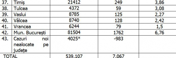 În ultimele 24 de ore, cele mai multe infectări au fost raportate înCluj (407), Constanța (510), Ilfov (664) și București (1.762), iar cele mai puține în Gorj (20) și Harghita (17).