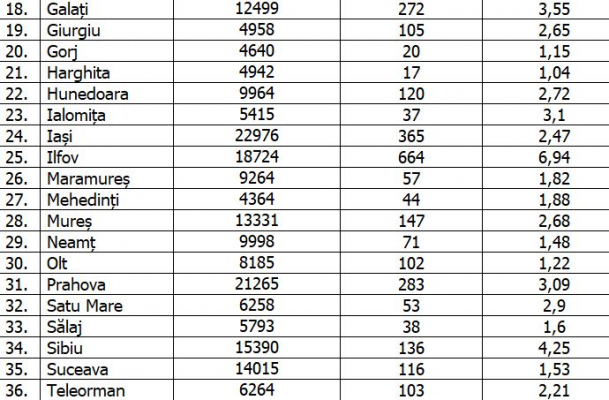 Cele mai mici rate de infectare se înregistrază în județele Gorj (1,15), Harghita (1,04) și Olt (1,22 la mia de locuitori, în ultimele 14 zile).