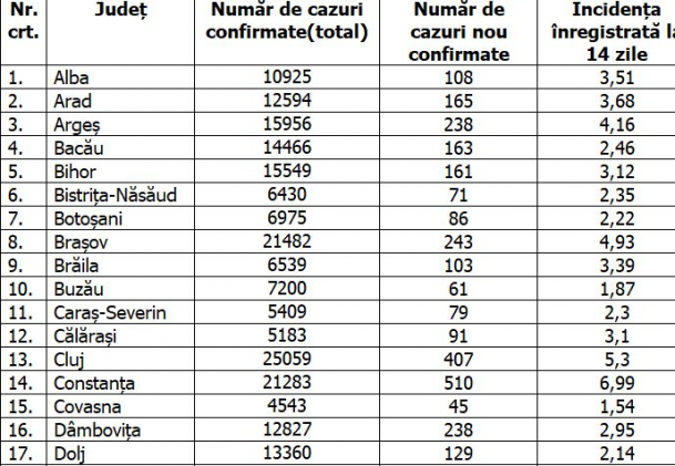 Niciun județ nu mai are o rată de infectare cu coronavirus de peste 7 la mia de locuitori, dar trei au o incidență de peste 6: București (6,76), Constanța (6,99) și Ilfov (6,94 la mia de locuitori, în ultimele 14 zile).