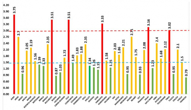Județe din România unde rata de incidență a noului coronavirus depășește 2,5 la mia de locuitori